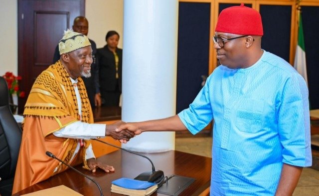 Governor of Rivers State, Sir Siminalayi Fubara (right) in a handshake with Alhaji Nasir Uhor, leader of the Muslim Community in Rivers State during a visit to the Governor at the Government House, Port Harcourt, on Friday.